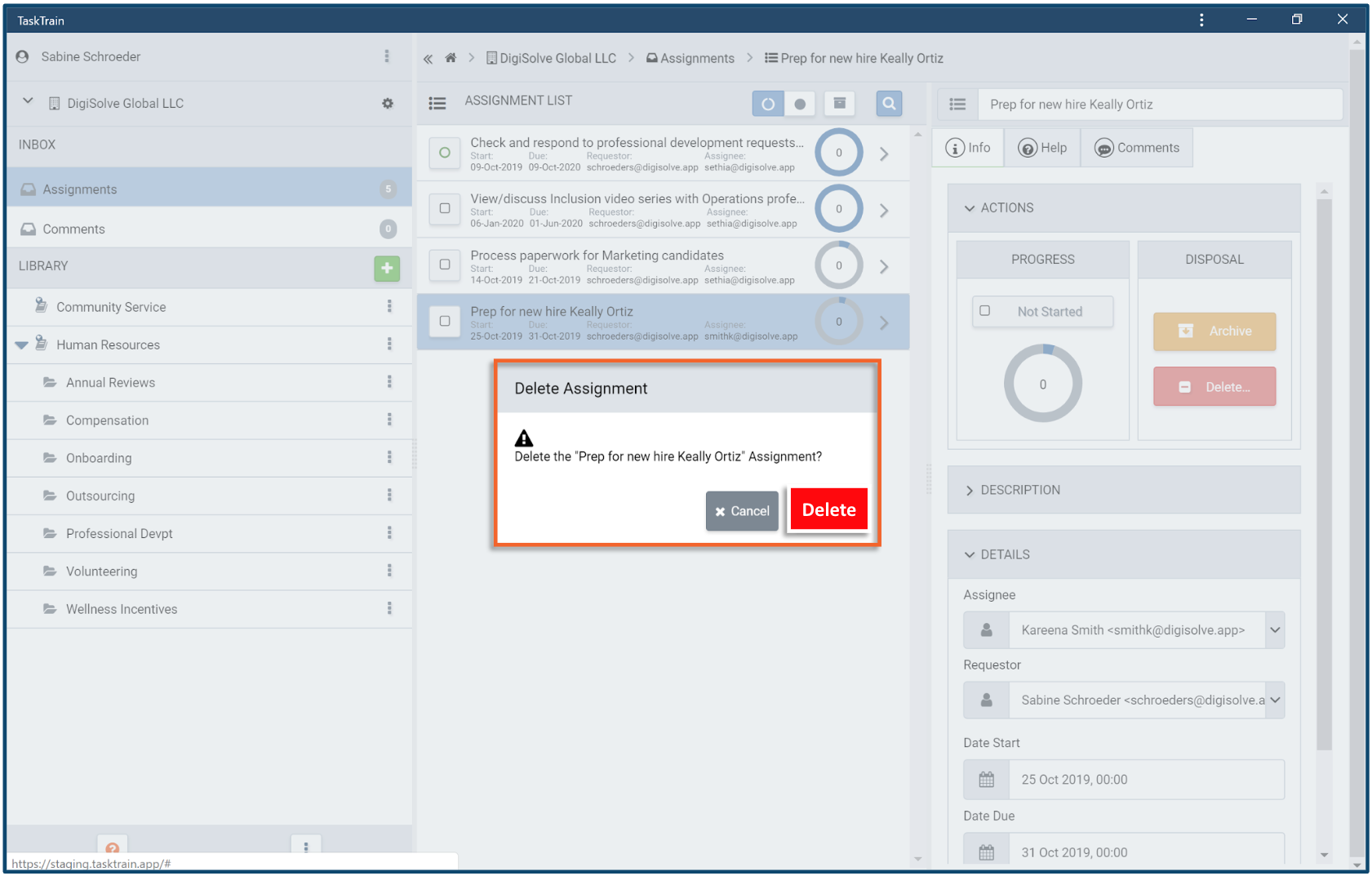 - Press the Delete button in the confirmation dialog to permanently delete the selected Assignment.