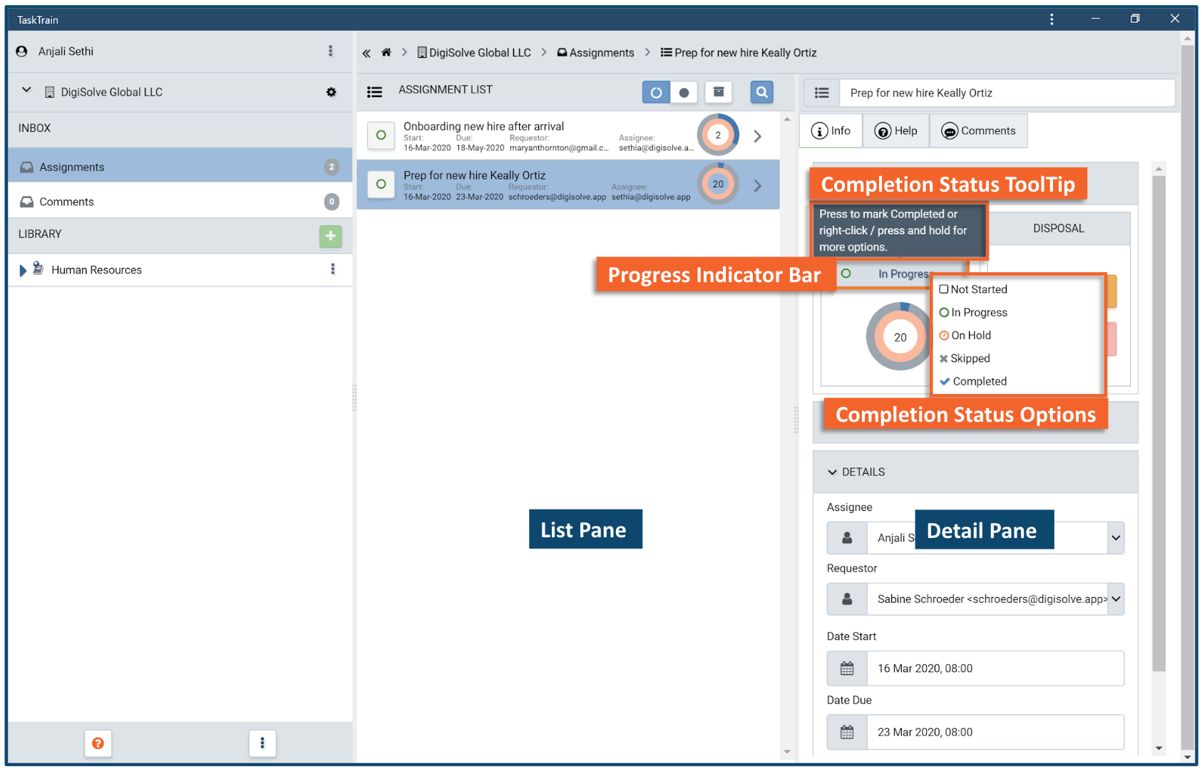Completion Status for an Assignment or Task may be updated from either the Assignment or Task list or detail panes. An appropriate status may be selected from a menu or toggled to a quick-complete option with a single press.