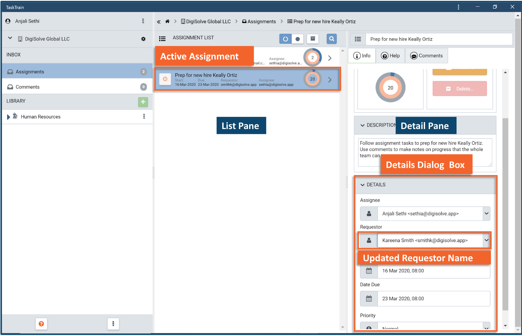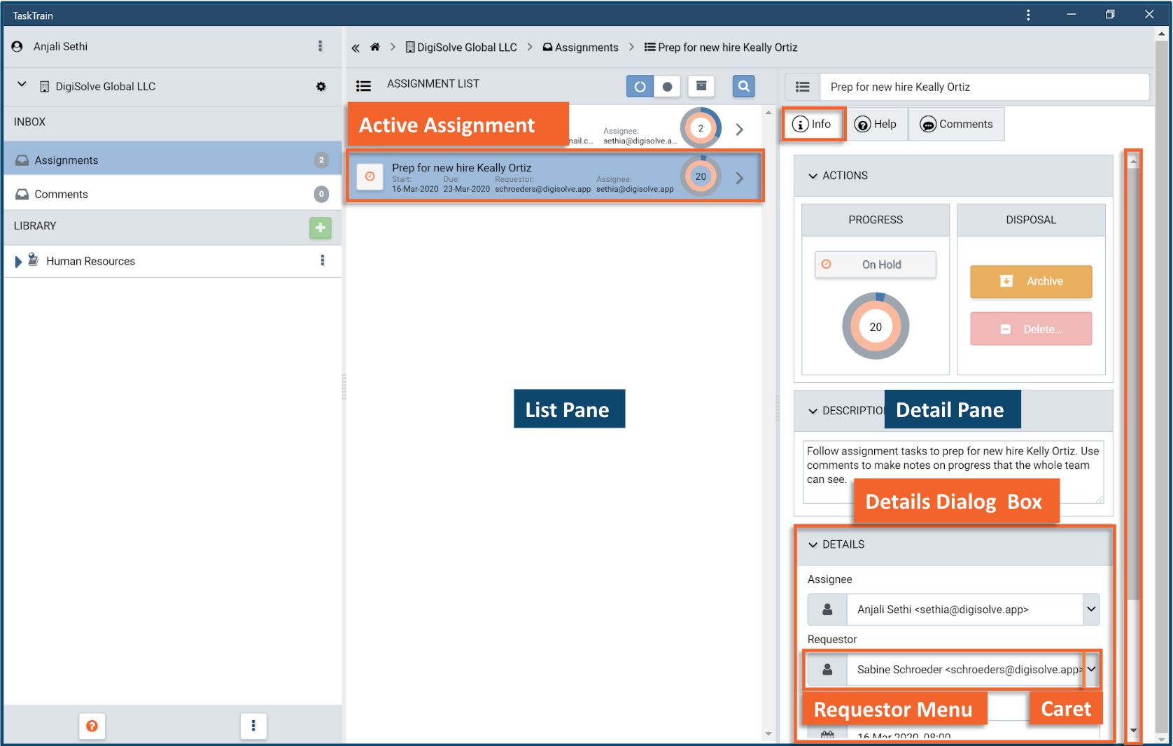 - Press the Info tab on the detail pane to display the Assignment Info panel.