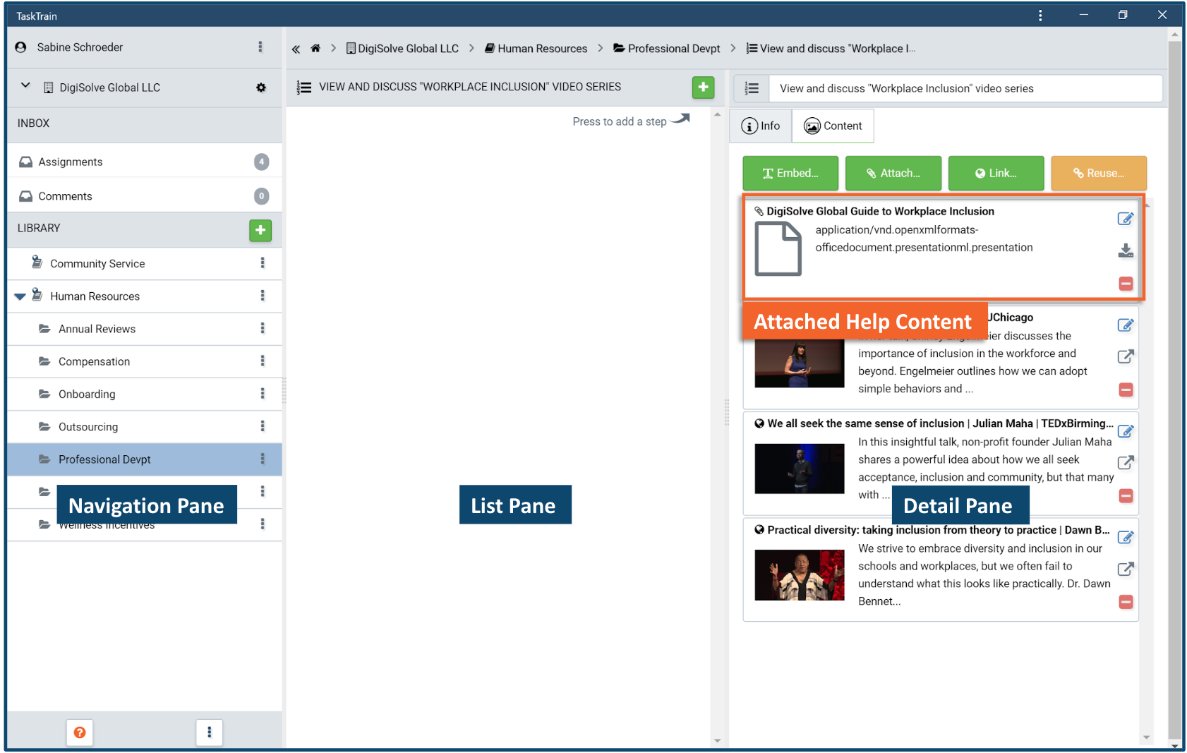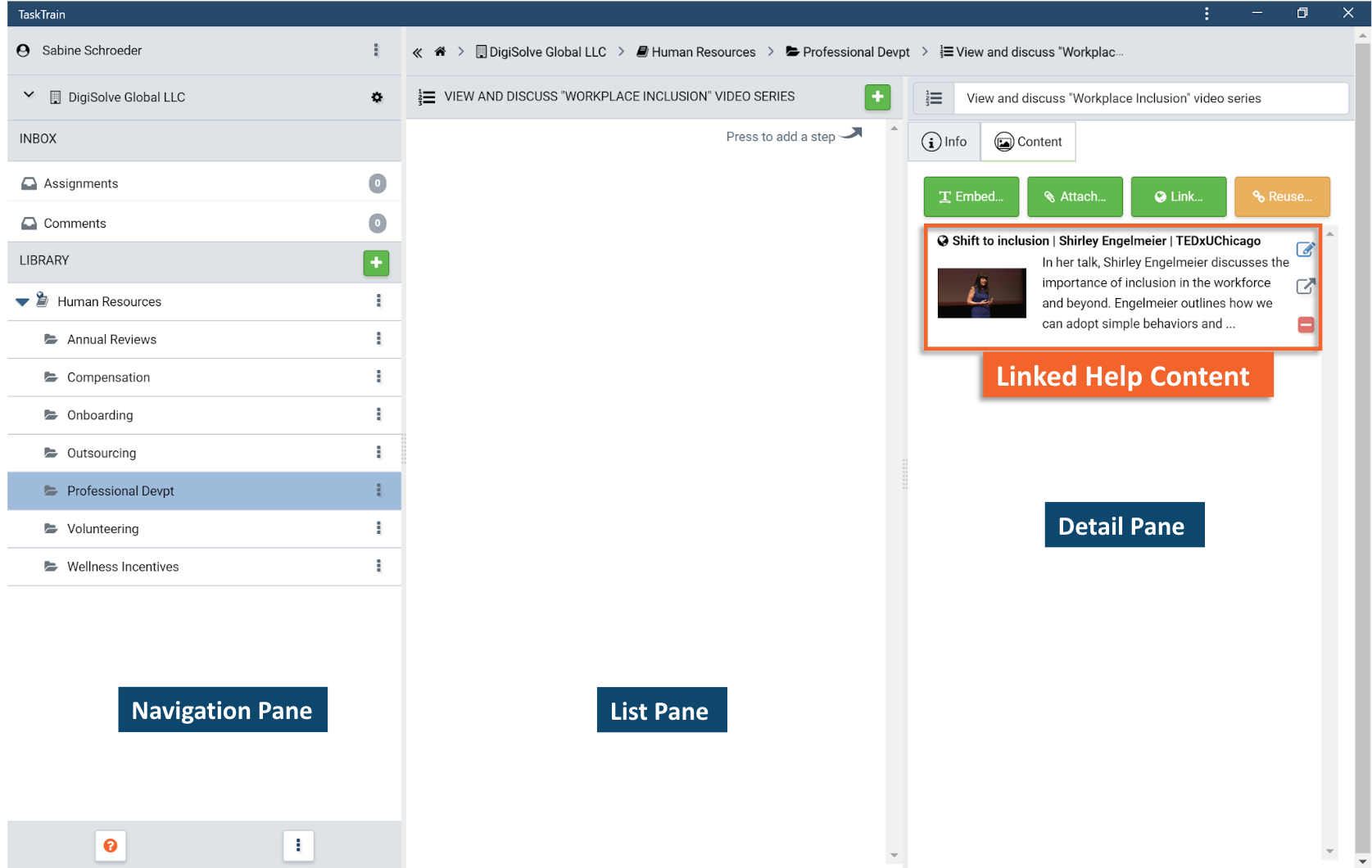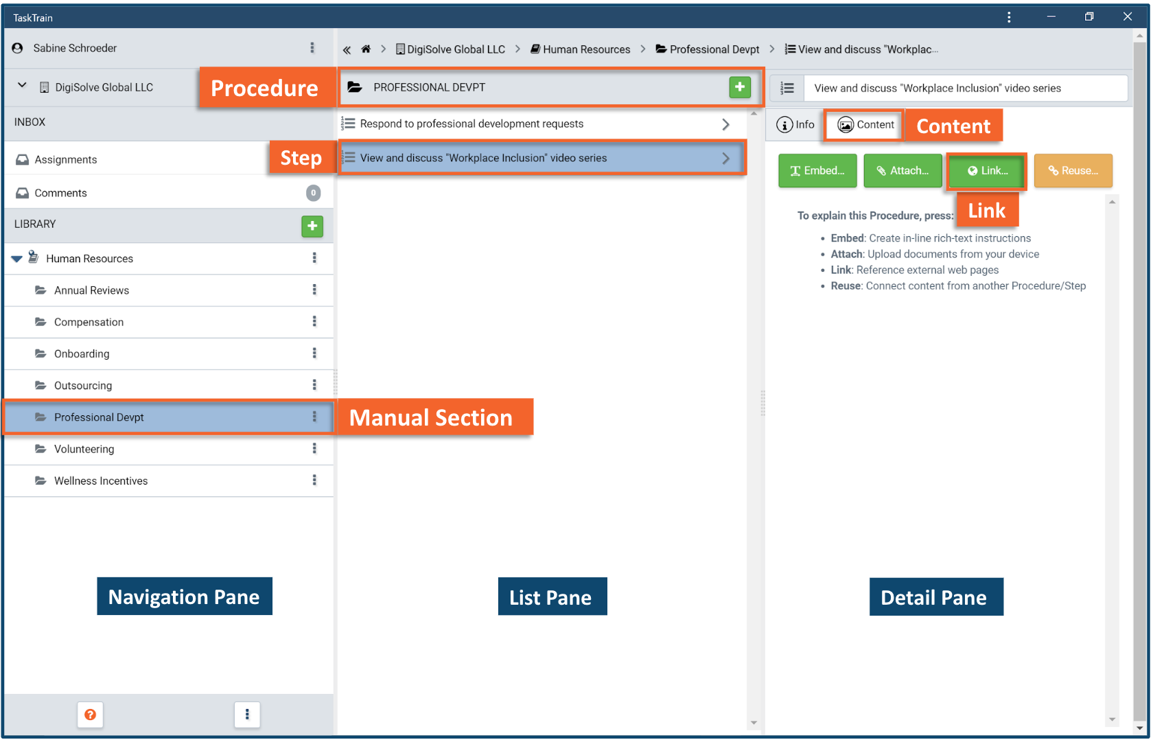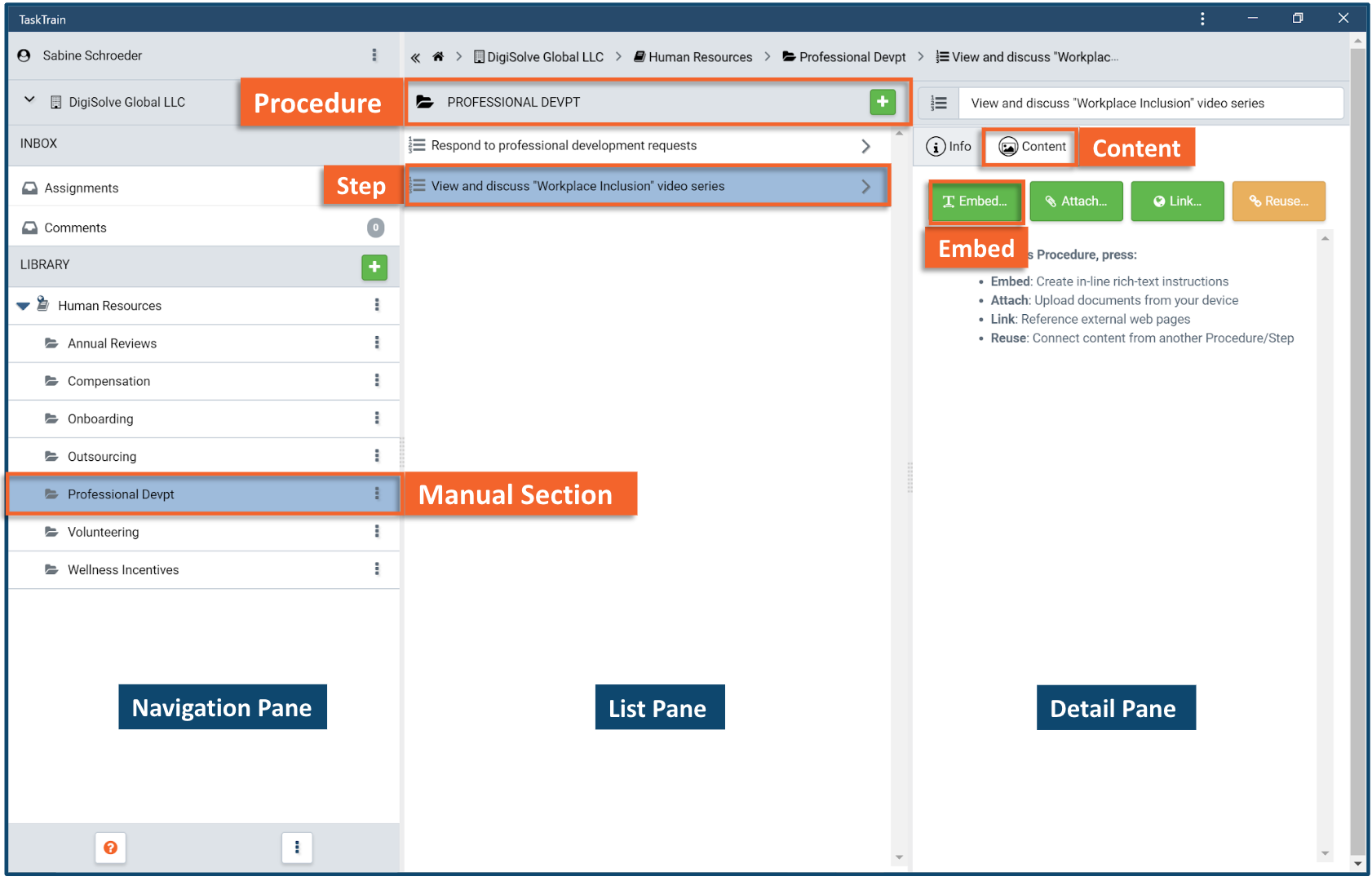 Content is work instructions or reference material associated with one or more Procedures or Steps. Content becomes viewable as Help on a the Assignment or Task corresponding to the Procedure or Step to which the Content is connected. While each Procedure or Step has only one Detail formatted-text field intended to contain explanations or instructions unique to that Procedure or Step, it may have multiple pieces of associated Content, each of which may be shared/reused among different Steps and Procedures within the same Manual. Manual Owners or Managers may modify Procedures.