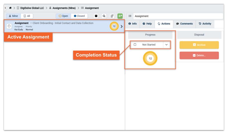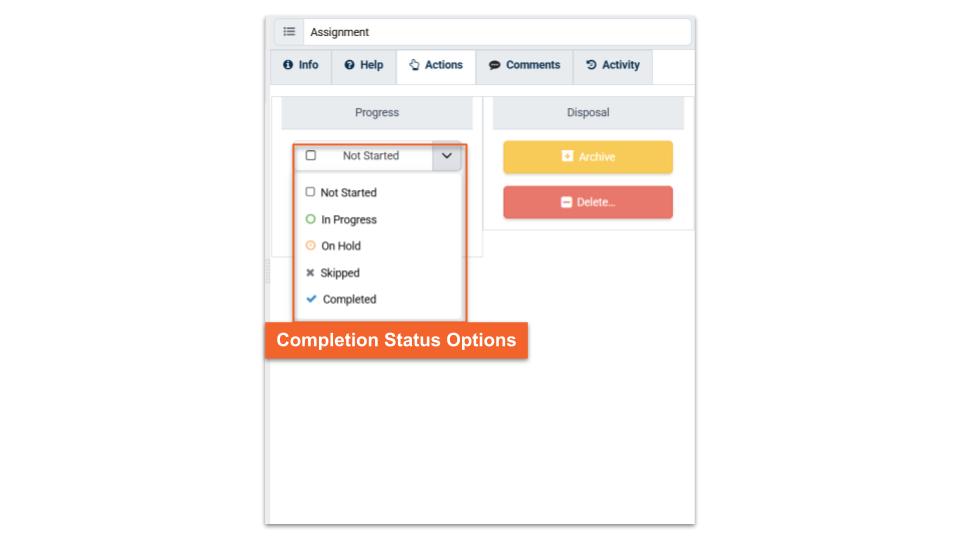 Completion Status for an Assignment or Task may be updated from either the Assignment or Task list or detail panes. An appropriate status may be selected from a menu or toggled to a quick-complete option with a single press.