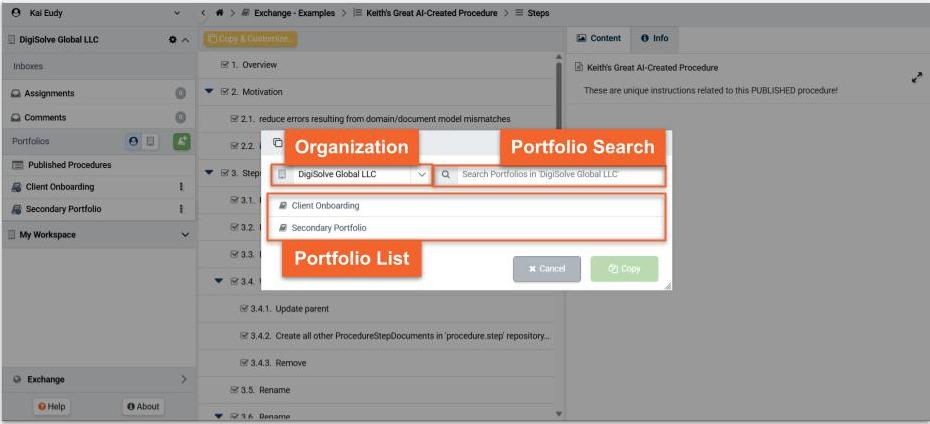 Choose the Organization and Portfolio where you want the procedure copied, then select Copy.