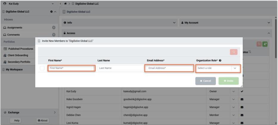 - Enter the requested information for each new member to invite. A new row will display when required information is complete to allow multiple invitations.