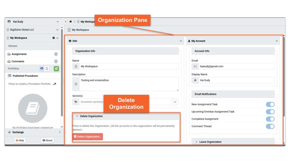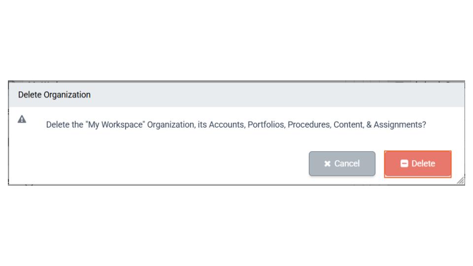 You must be an Administrator of an Organization to delete it. Deleting an Organization permanently removes everything associated with the workspace: All Accounts, Portfolios, Procedures, Content, and Assignments. Deleting an Organization cannot be undone.