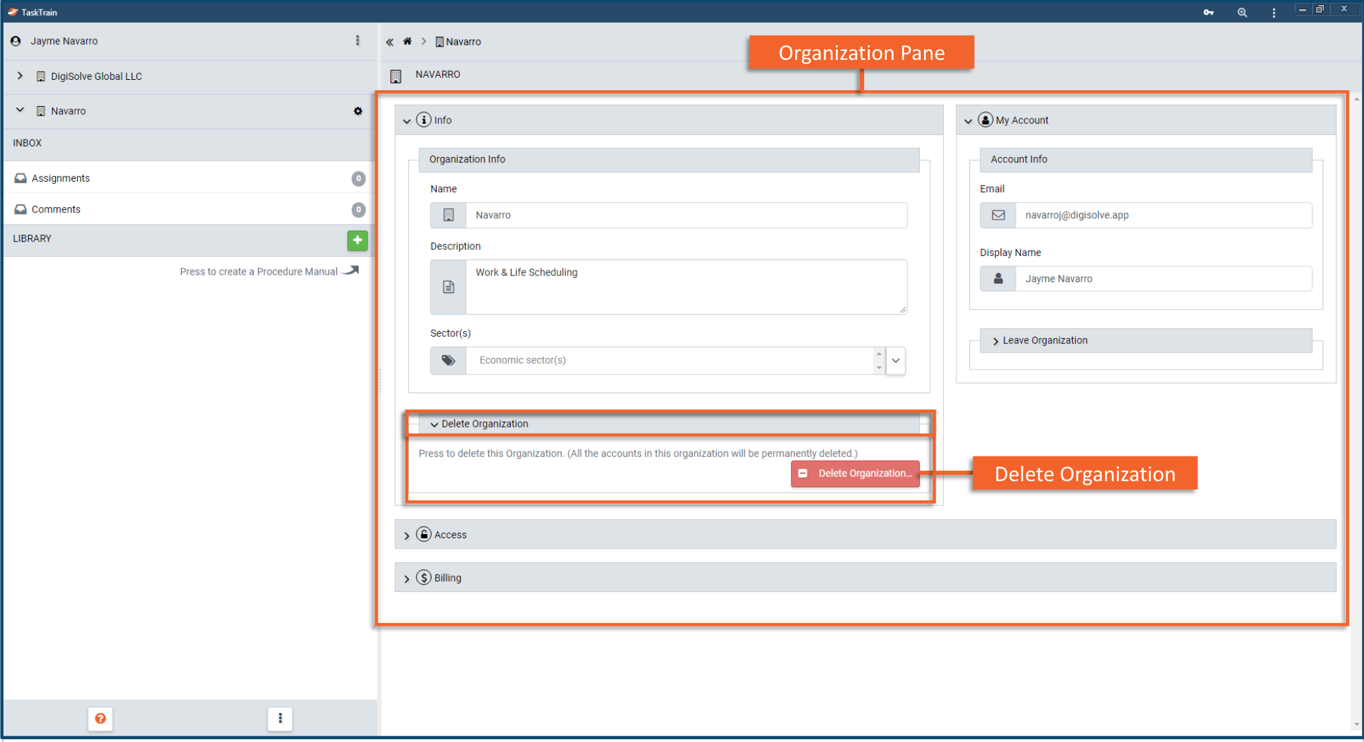 You must be an Owner of an Organization to delete it. Deleting an Organization permanently removes everything associated with the workspace: All Accounts, Manuals, Procedures, Content, and Assignments. Deleting an Organization cannot be undone.