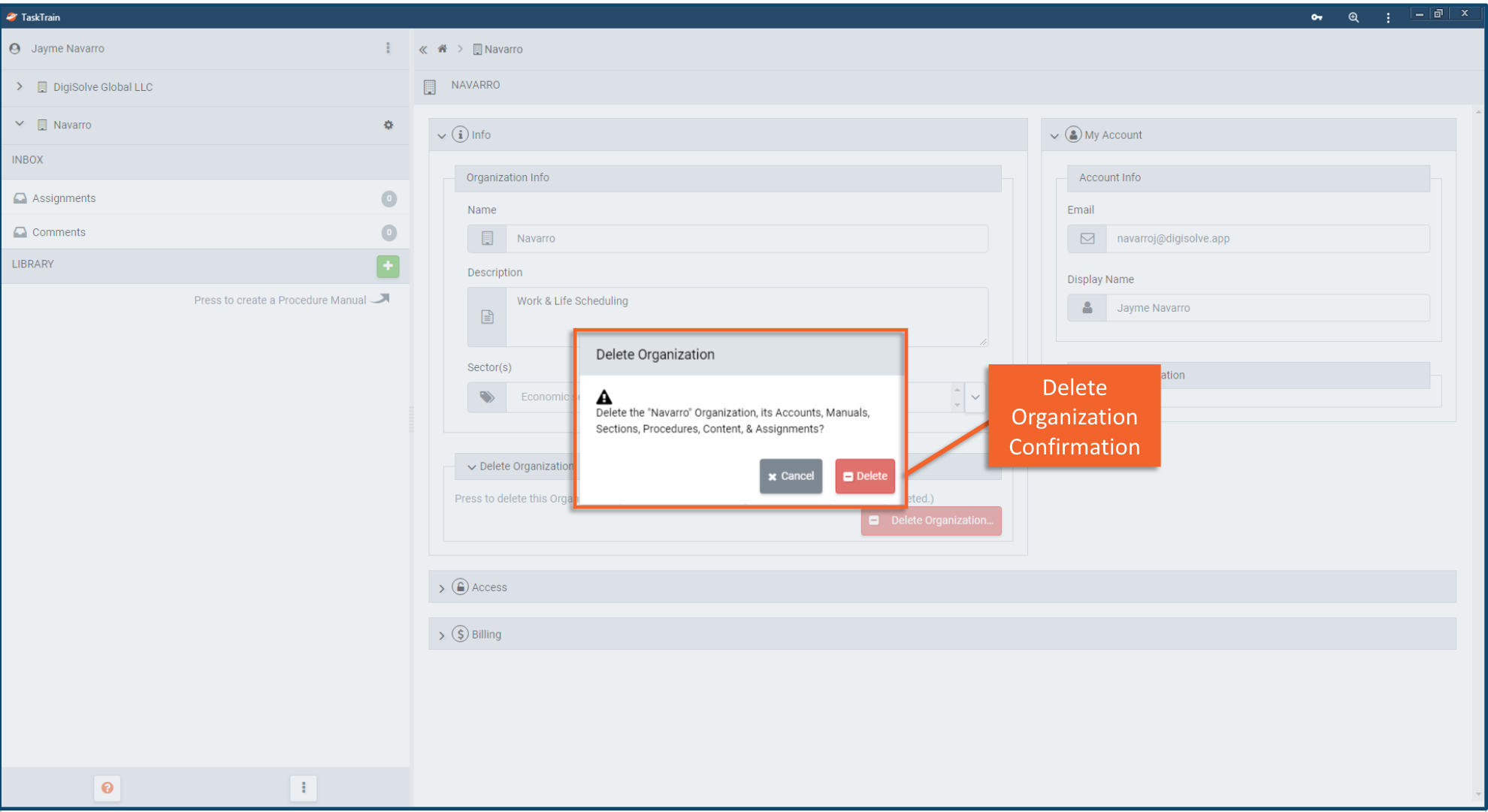 - Press the Delete button in the Delete Organization confirmation dialog that appears.