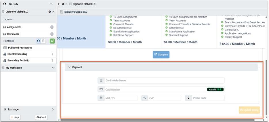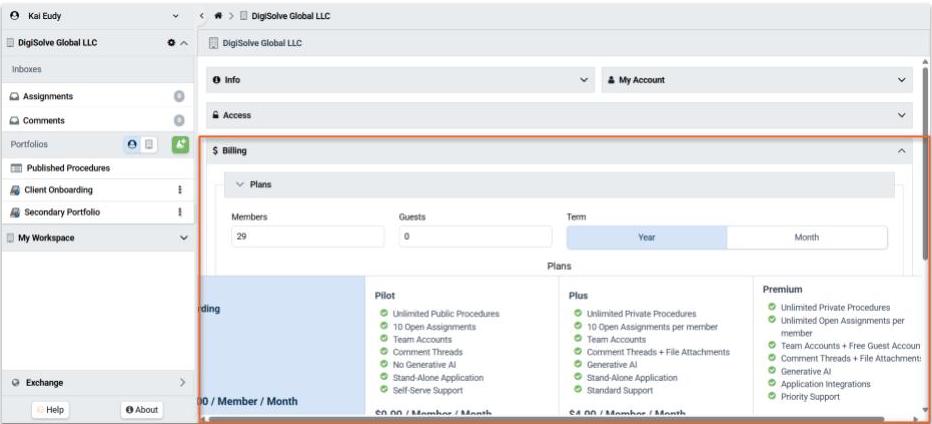 - Press the Update button to save any changes to the subscription plan tier, term, or payment method.