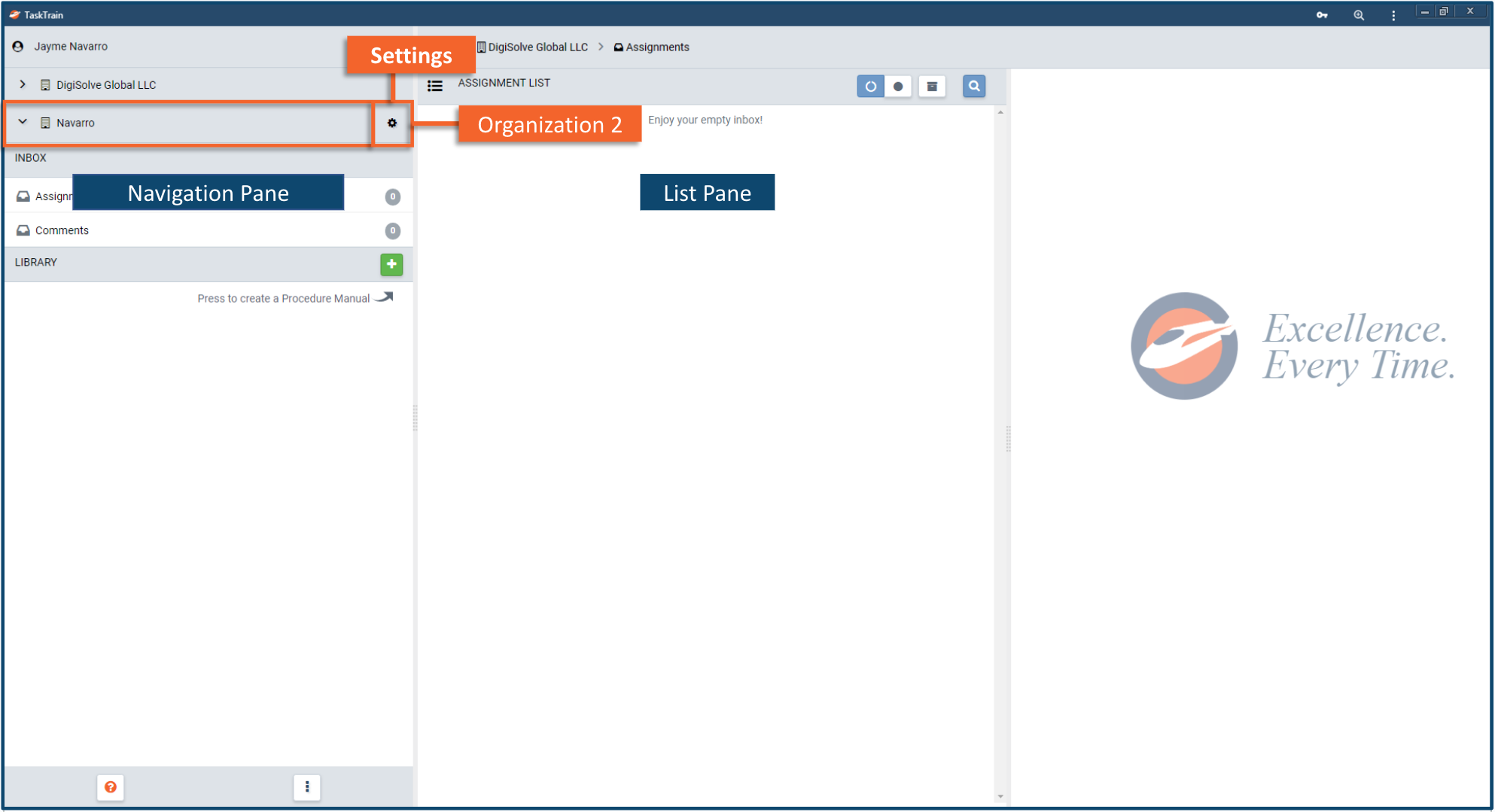 - Press the Manage Organization gear icon next to the Organization name in the left Navigation pane to display Organization details.