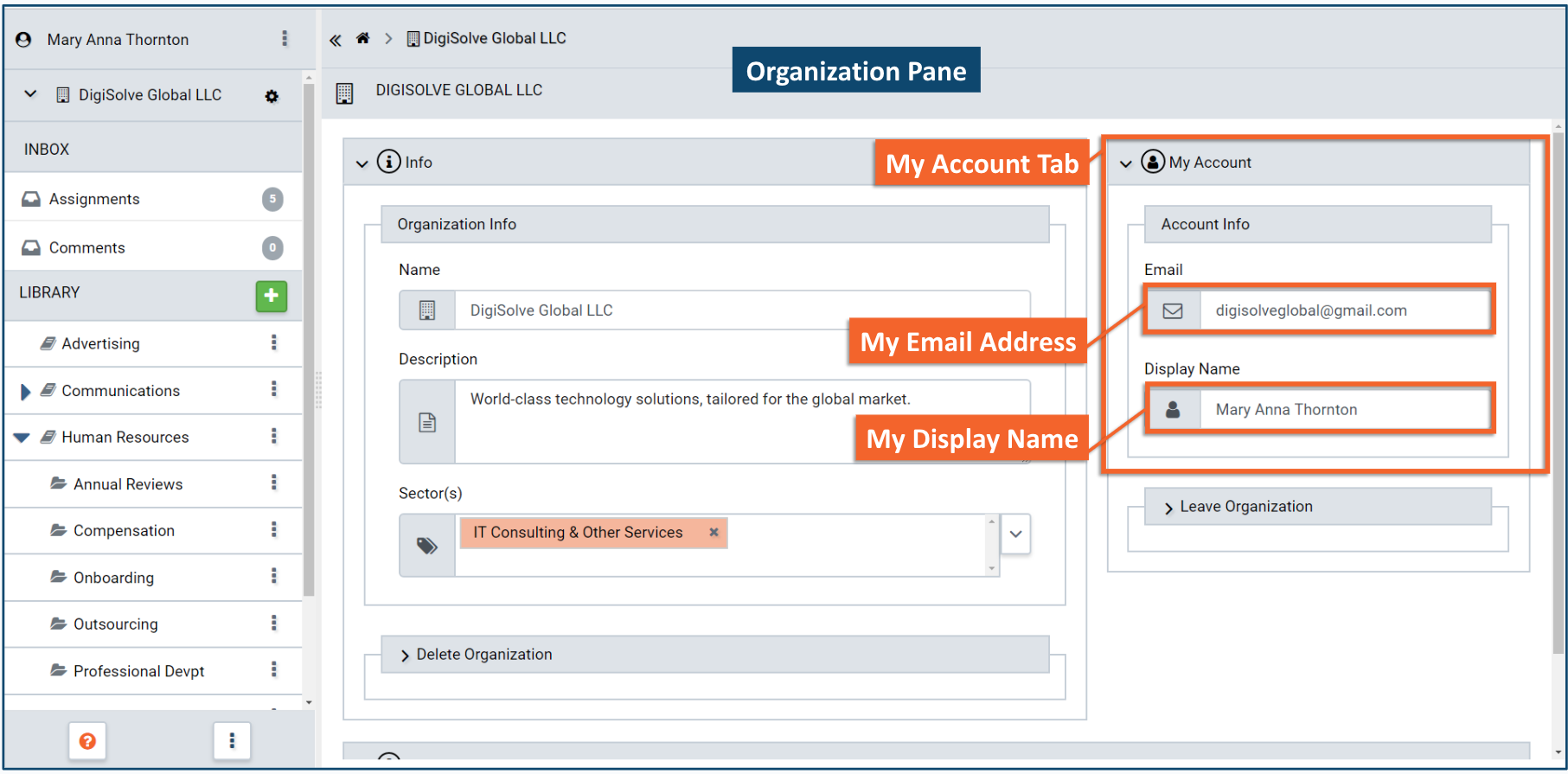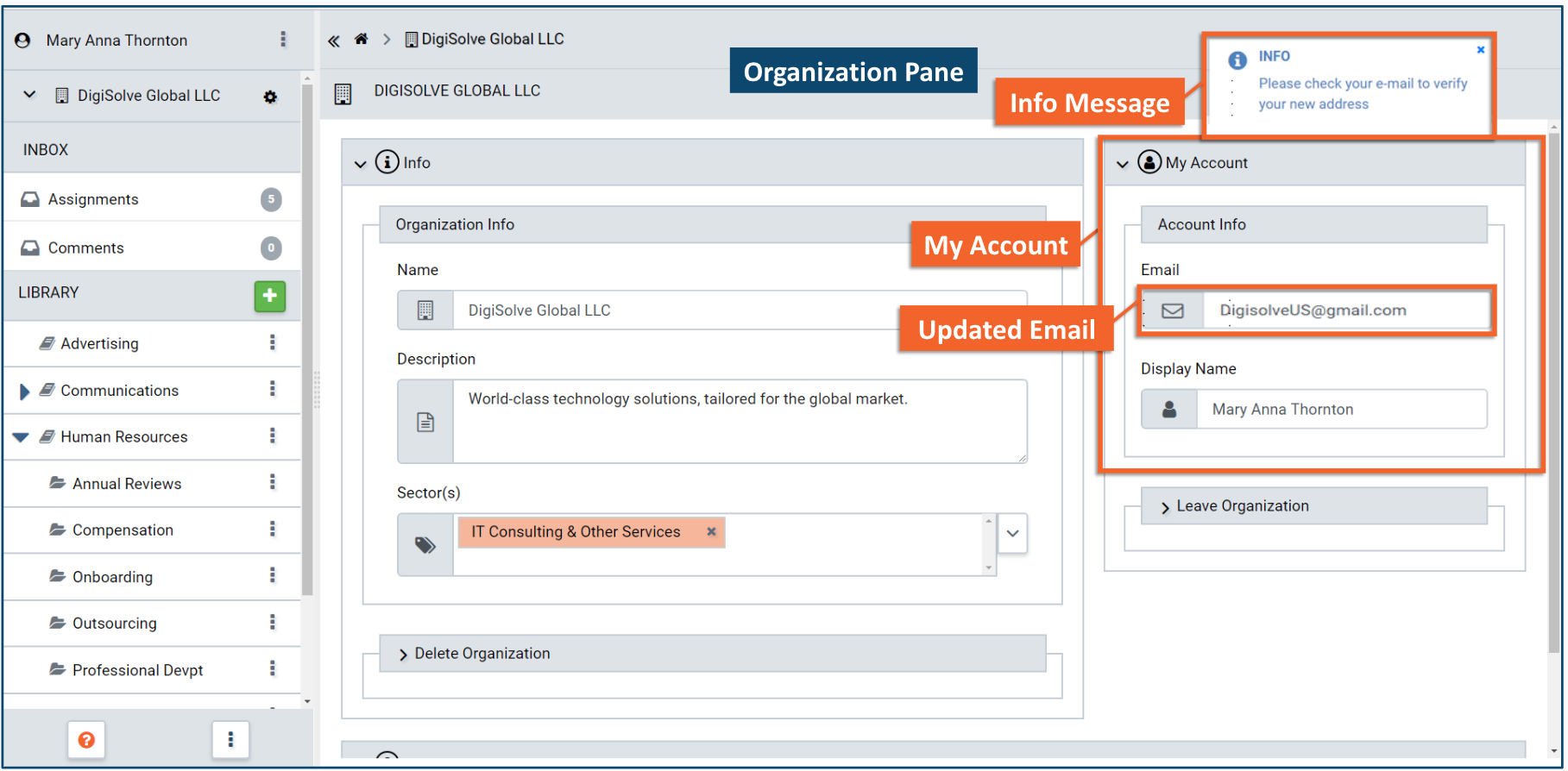 - Enter updates to the e-mail address and/or display name associated with this Organization.