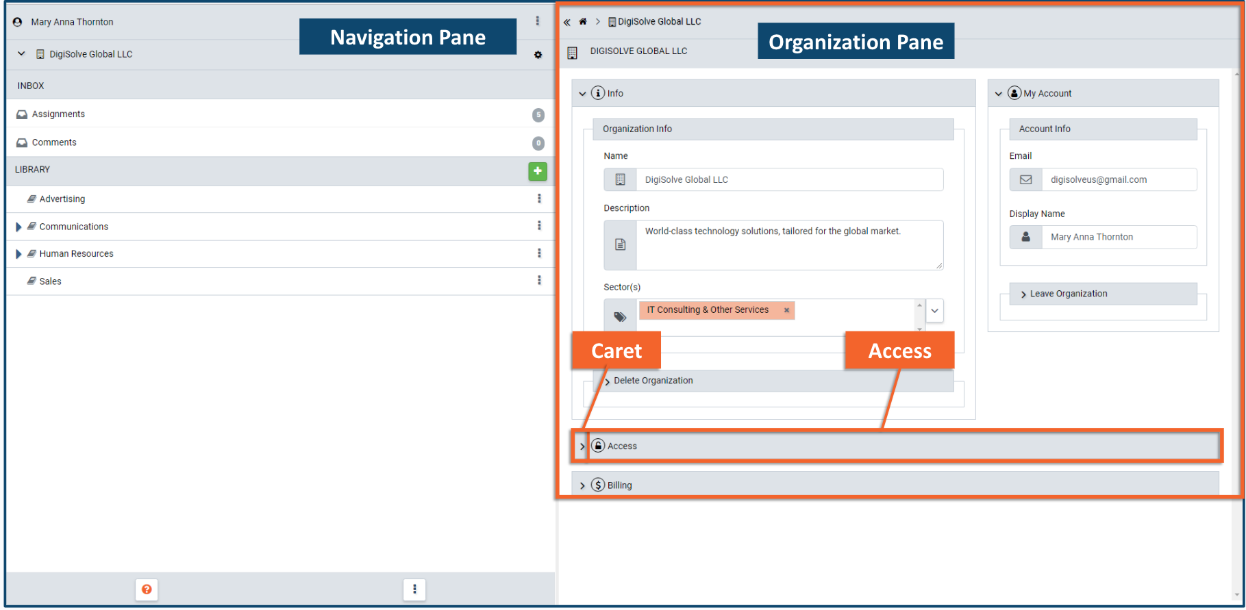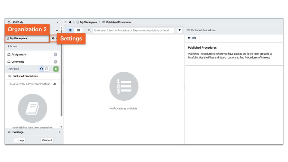 - Press the Manage Organization gear icon on the Organization collapsible panel in the Navigation pane to display Organization details.