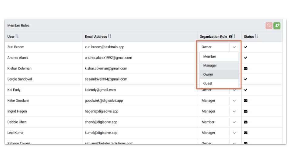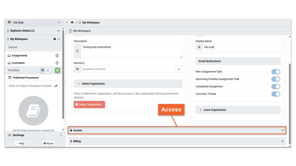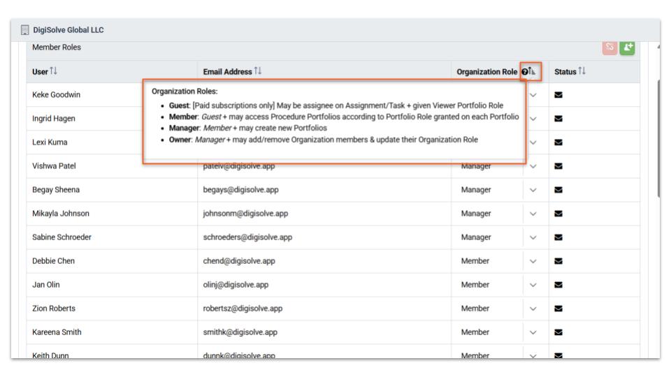 - Workspace Access permissions may be viewed by pressing the Help (?) icon in the Organization Role column header.