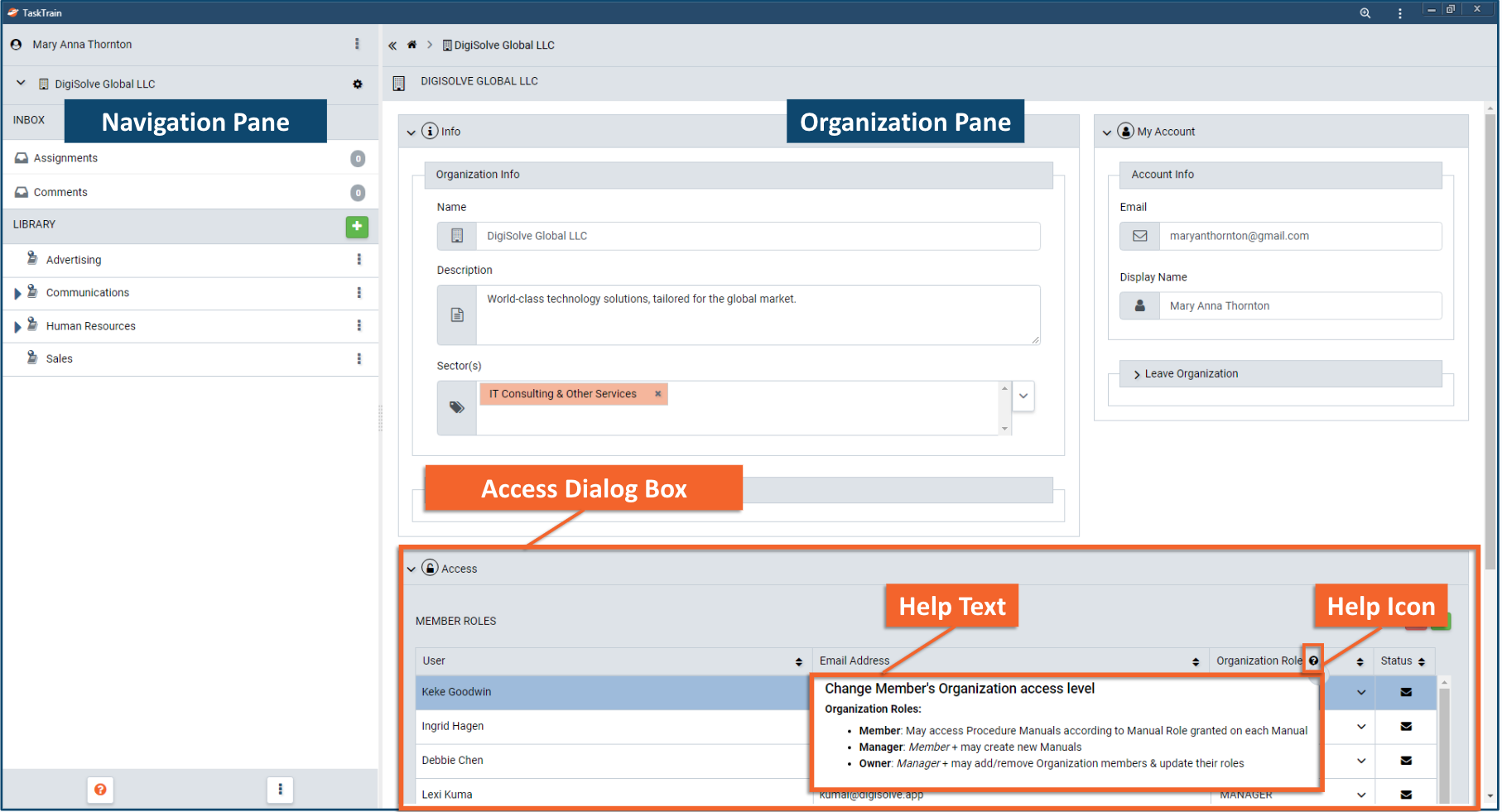 - Organization Role permissions may be viewed by pressing the Help (?) icon in the Organization Role column header.