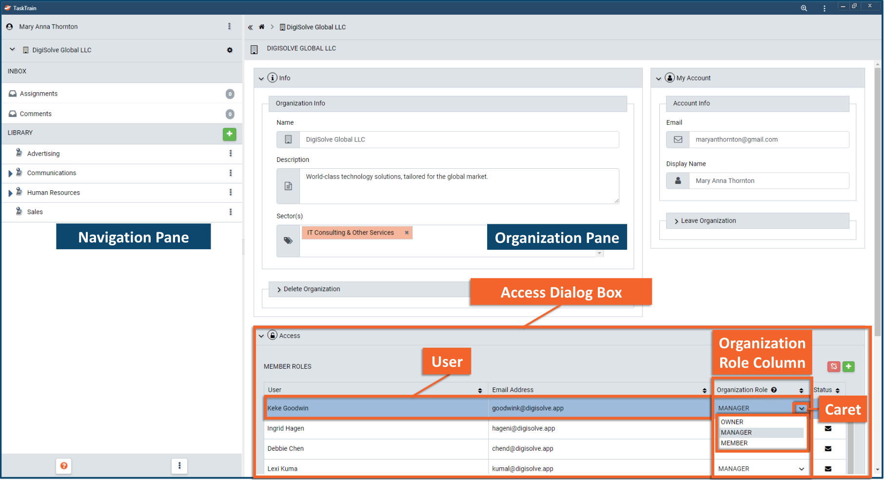 - Select an appropriate permission level for an Account using the menu in the Organization Role column.
