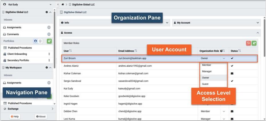 Workspace Access grants an Organization Member permission to take certain actions within TaskTrain. The four Organization Roles within TaskTrain are Associate, Lead, Administrator, and Guest.