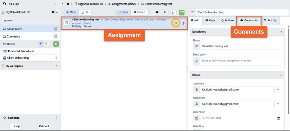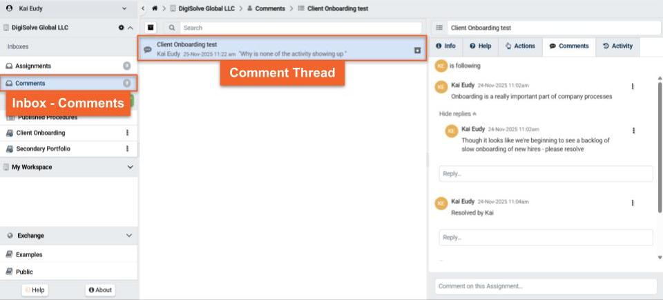 The Inbox - Comments organizes all Comment Threads a User's Account in an Organization is included in, either as the Assignment or Task Assignee, or as an explicitly added Follower.