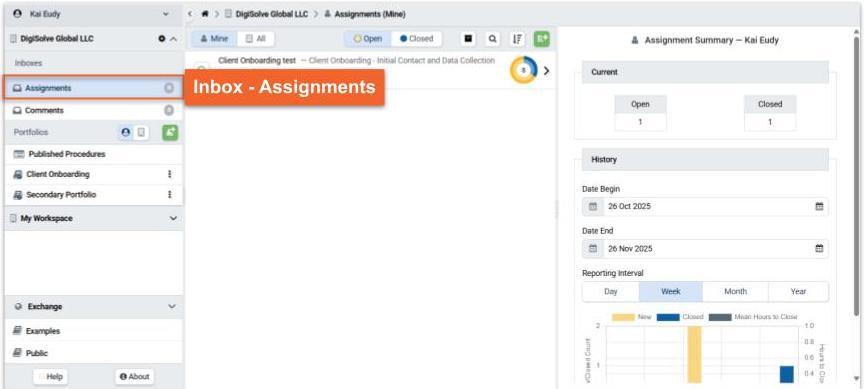 The Inbox - Assignment organizes all Assignments for which User's Account in an Organization is the Requestor or the Assignment or Task Assignee.