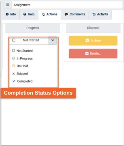 A Completion Status indicator identifies the stages that an Assignment or Assignment Task may pass through: Not Started, In Progress, On Hold, Skipped, or Complete. Changes to the Completion Status of a child or sub Task automatically updates the status of its parent task, and vice versa. Updating Task Completion Status automatically updates Assignment status, and vice versa.