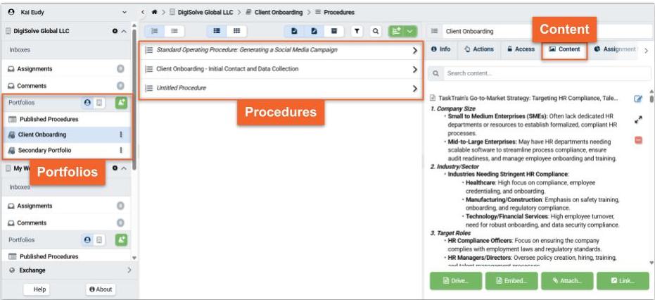Portfolios organize Procedures and control the access Organization Members have to the Procedures (and related Assignments) they contain.