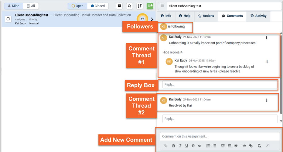 A Comment Thread is a series of related Comments made on an Assignment or Task, similar to an e-mail discussion thread.