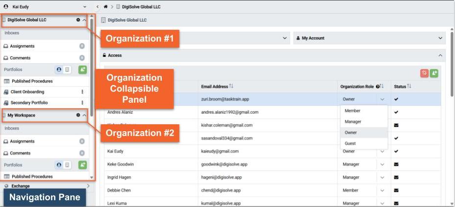 An organization member may access Portfolios and their procedures with associated Content and Assignments according to their Portfolio Access