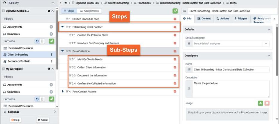 A Procedure is a set of step-by-step work instructions documenting your Standard Operating Procedures, captured in a multi-level outline of Procedure Steps, each of which may contain explanatory Content.