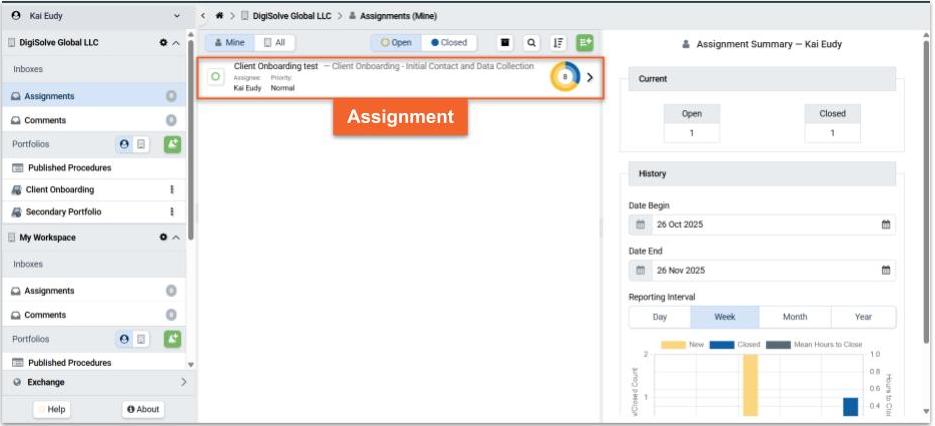 An Assignment​ is a unique instance of a Procedure used as a checklist to guide and track work. Each Assignment may have its own Assignee, Start Date, Due Date, Priority, and Completion Status.