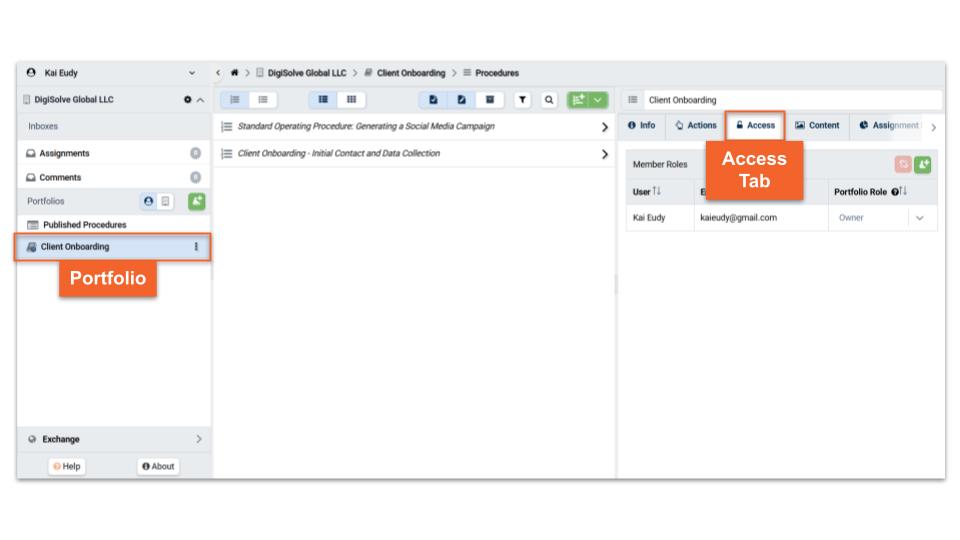 Creating, viewing, editing, assigning Procedures and managing related Assignments require Access on the relevant Portfolio. A Portfolio Owner may change Member Access or remove members from a Portfolio.