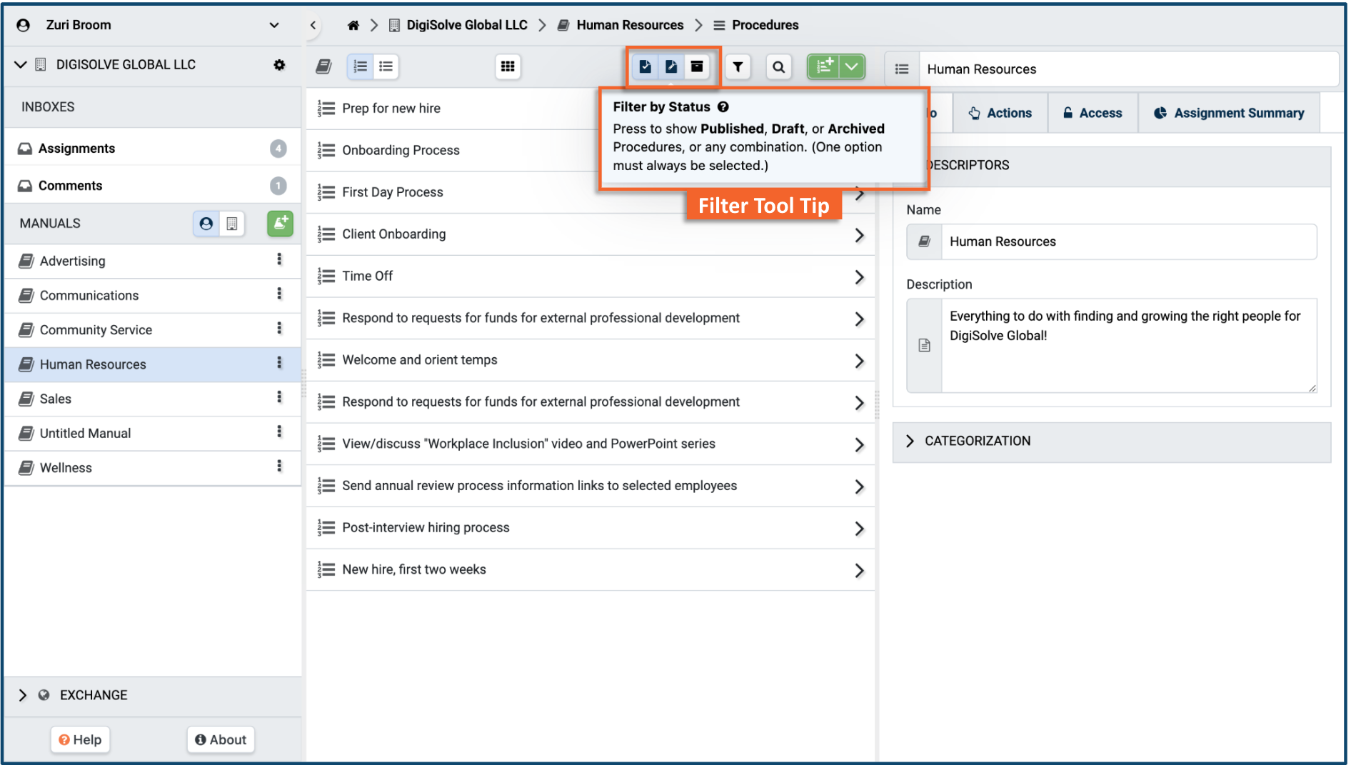 Procedures may be filtered by Status: Published, Draft, or Archived. (One option must always be selected)