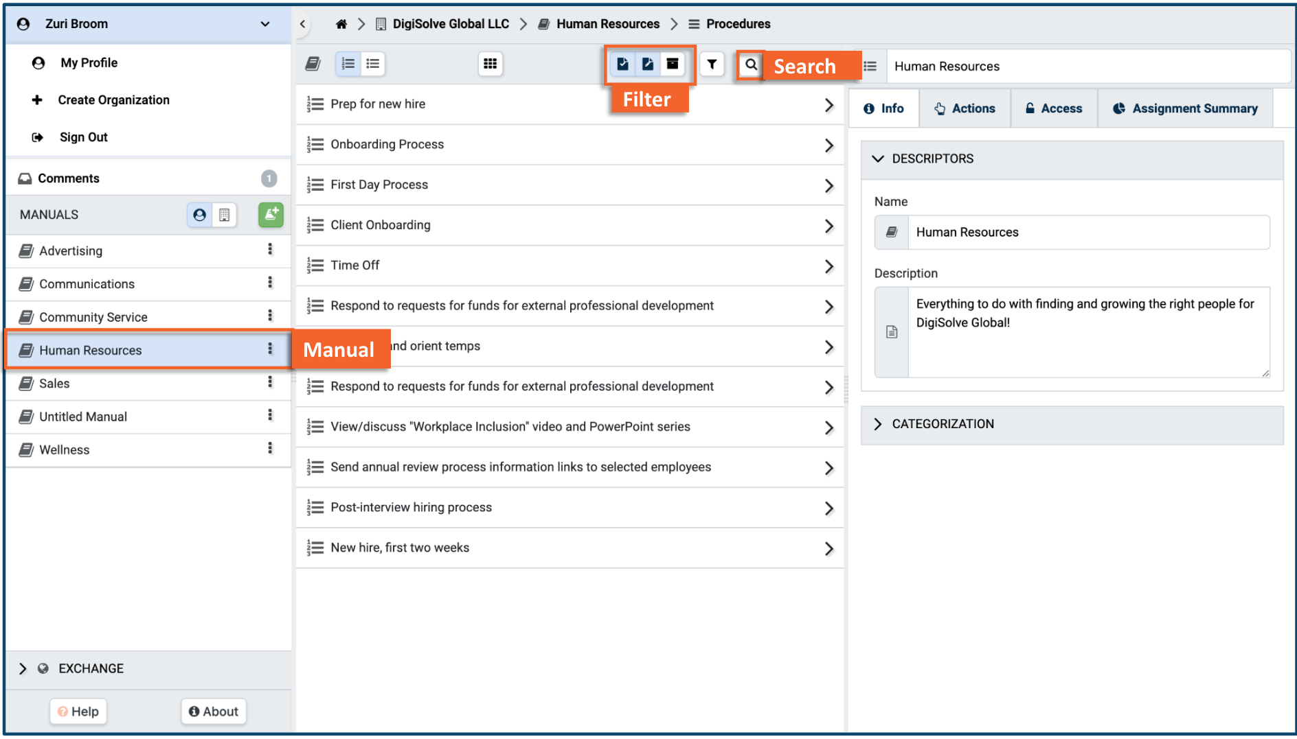 - Use the Filter or Search icons to filter Procedures by status or search for a Procedure by term, description, or detail.