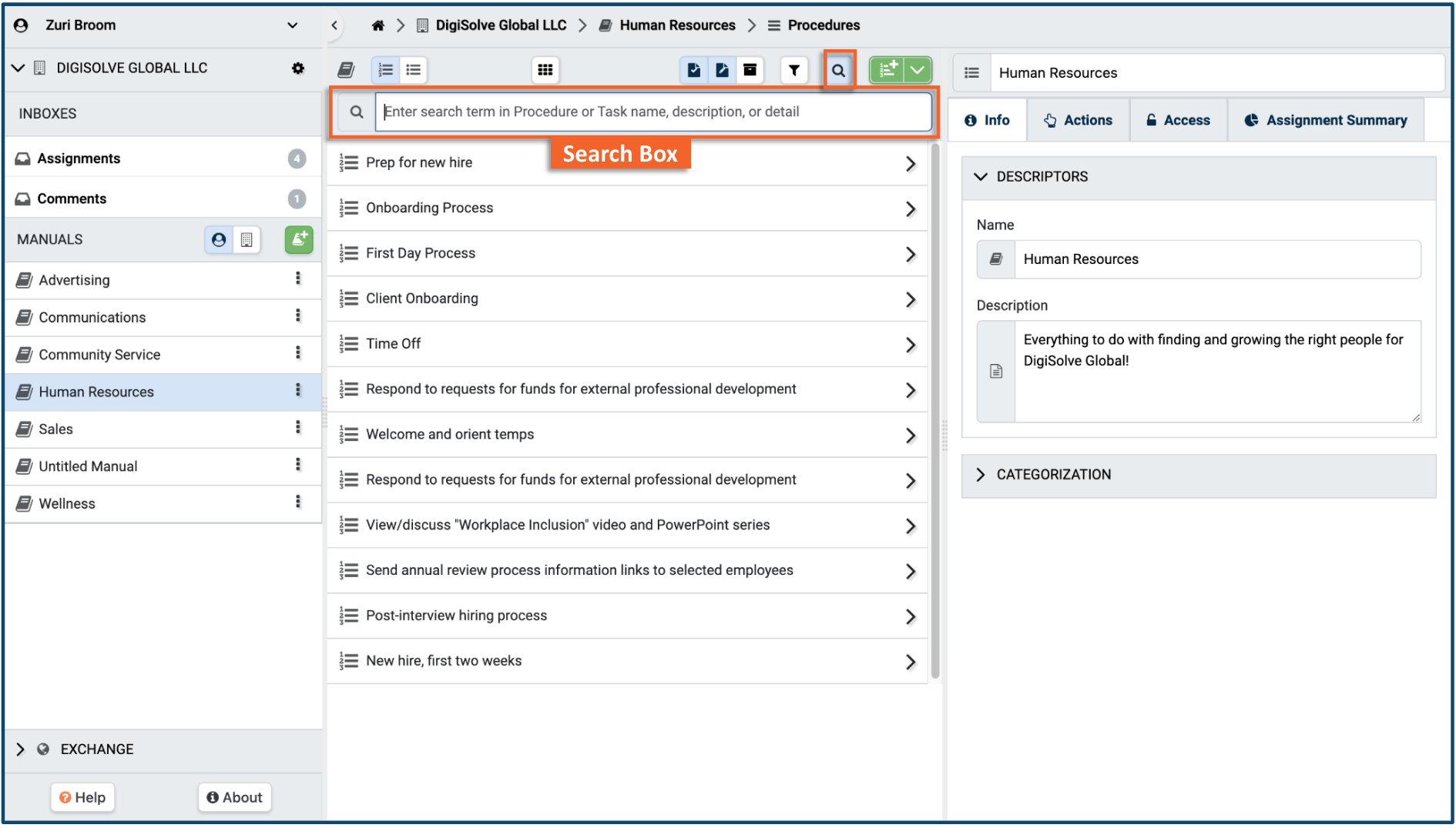 Procedures can be searched by a term in Procedure or Task Name, description, or detail .