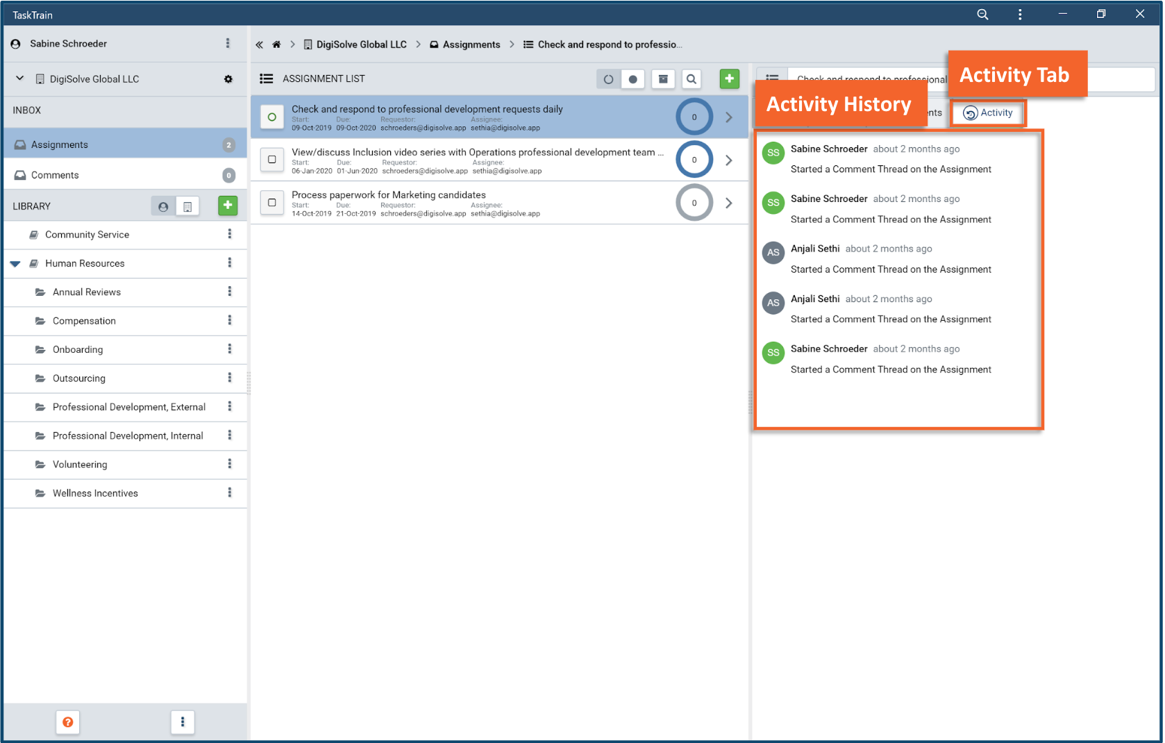 - Press the Activity tab in the detail pane to view the Activity History for the selected item, which is sorted in reverse chronological order.