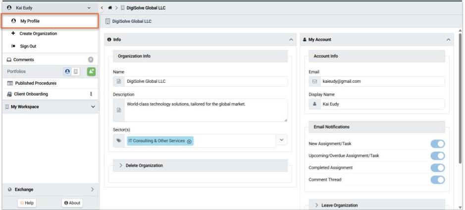 - Select My Profile from the User menu at the top of the left Navigation pane.