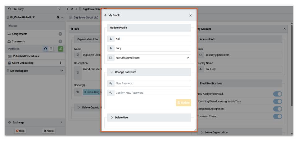- Select My Profile from the User menu at the top of the Navigation pane to display the User Profile dialog.