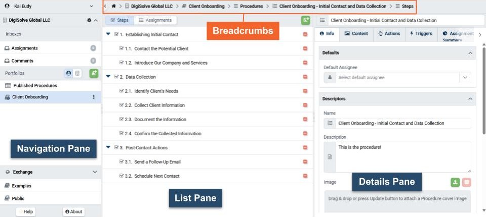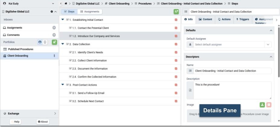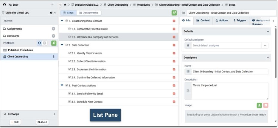 The List pane displays whatever the User selects in the Navigation pane. For example, when you have selected a Portfolio from the Library, the List pane will display the Procedures it contains. Likewise, when you have selected your Assignments Inbox, the List pane will display Assignments or associated Tasks..jpg)
