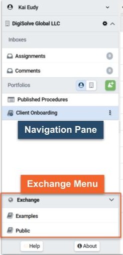 The Exchange Menu is located at the bottom of the Navigation Pane. It holds both sample Procedures provided by TaskTrain and Procedures created and shared by other users.