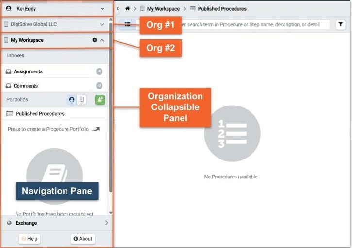 The Organization Collapsible panel is located just below the User Menu on the Navigation pane. Access the Organization menus (Inbox and Library) by pressing on the caret to the left of the Organization name.
