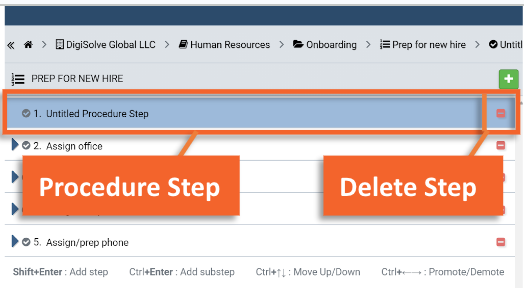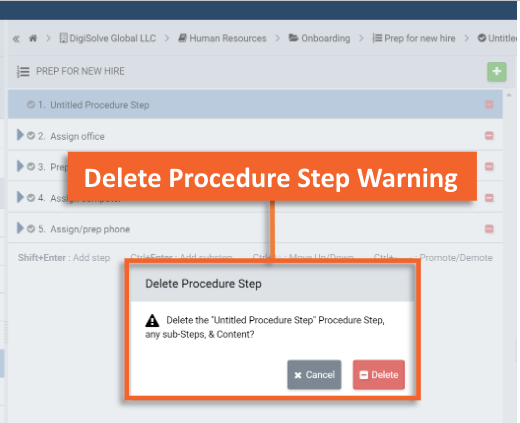 When you delete a Step, any child Substeps as well as Content solely connected with that Step or Substep will also be deleted. Content shared with other Steps will be preserved for reuse. Deleting Steps cannot be undone.