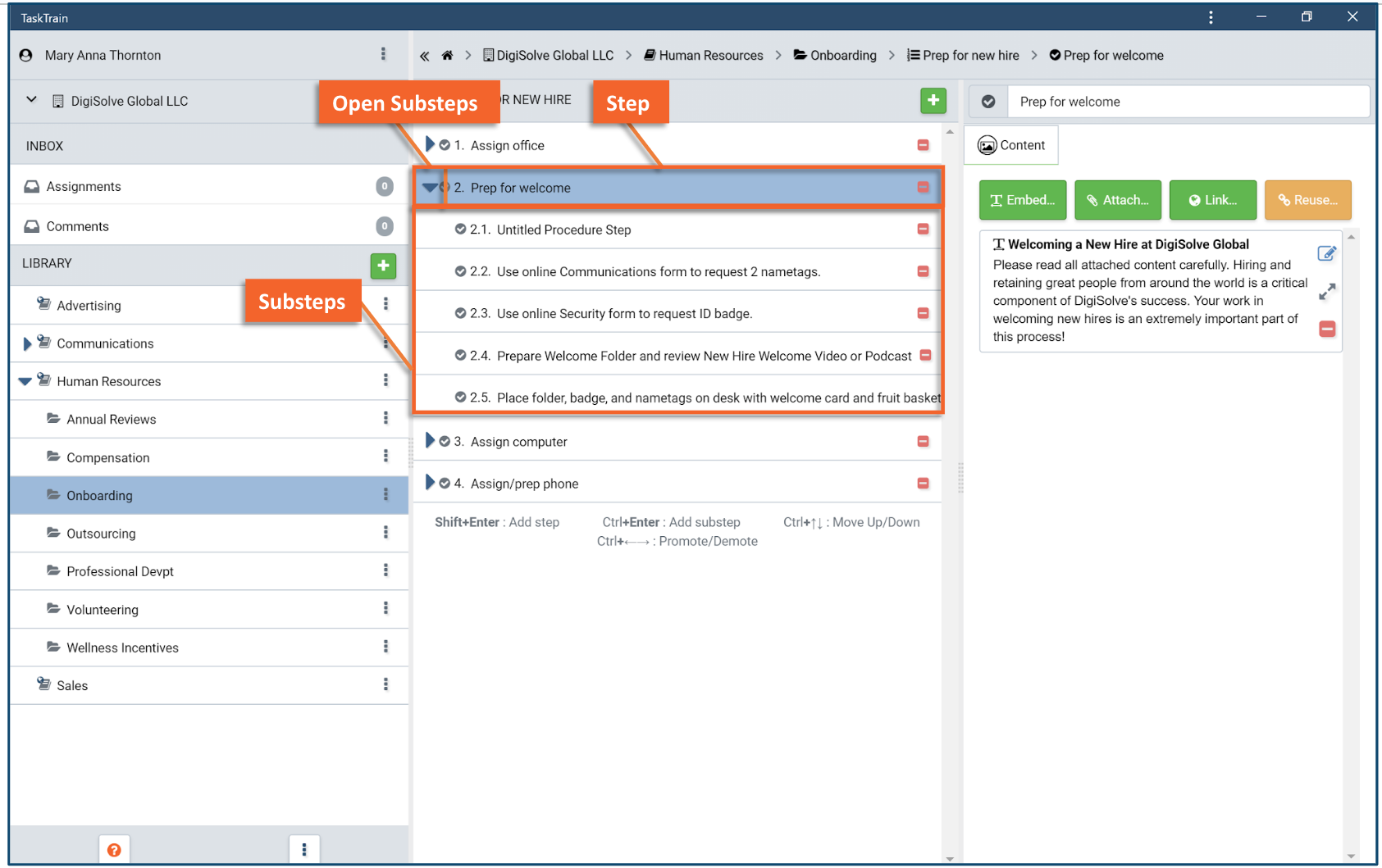 - Press the disclosure triangle to the left of the Step name to toggle a single Step open or closed and display or hide its Substeps, or
