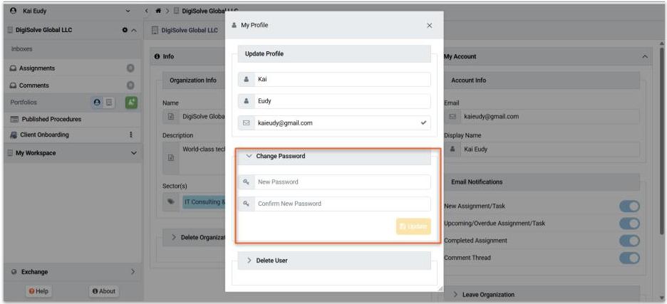 - Press on the Update button to change your password.